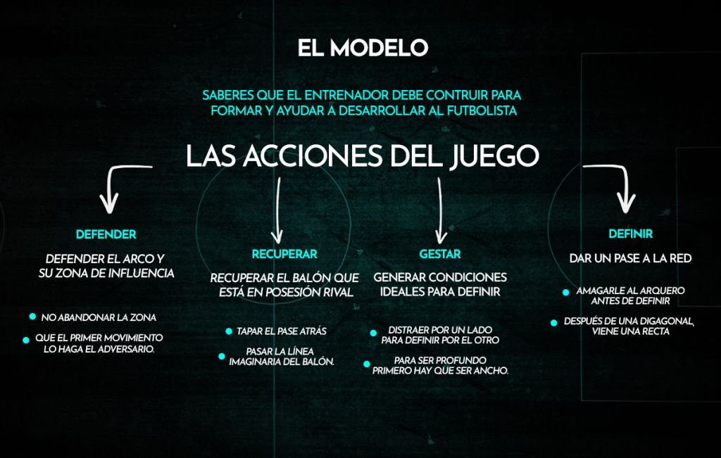 El fútbol se construye a partir de cuatro acciones fundamentales: Defender, Recuperar, Gestar y Definir. Todo el juego se articula, además, sobre tres principios esenciales: el tiempo, el espacio y el engaño.